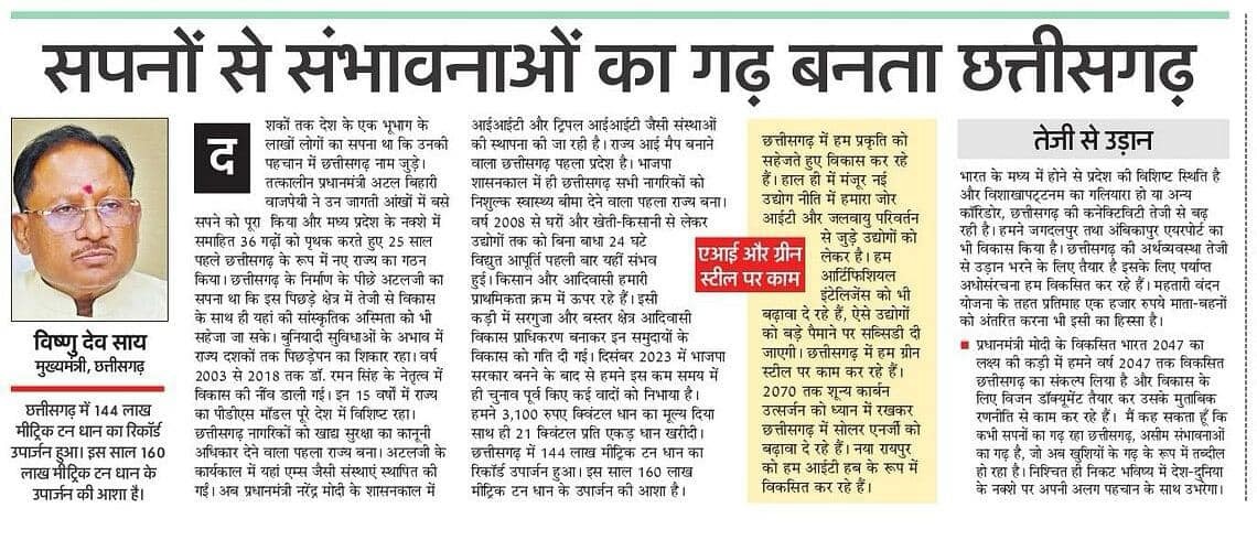 छत्तीसगढ़ राज्य स्थापना दिवस के अवसर पर माननीय मुख्यमंत्री श्री विष्णुदेव साय का आलेख।