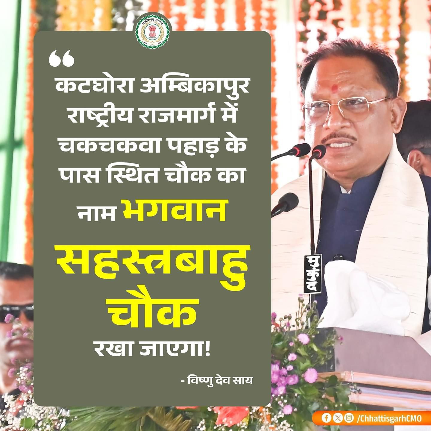 जनभावना को ध्यान में रखते हुए मुख्यमंत्री विष्णुदेव साय ने कटघोरा-अम्बिकापुर राष्ट्रीय राजमार्ग में चकचकवा पहाड़ के पास स्थित चौक को #भगवान_सहस्त्रबाहु के नाम पर रखने की घोषणा की