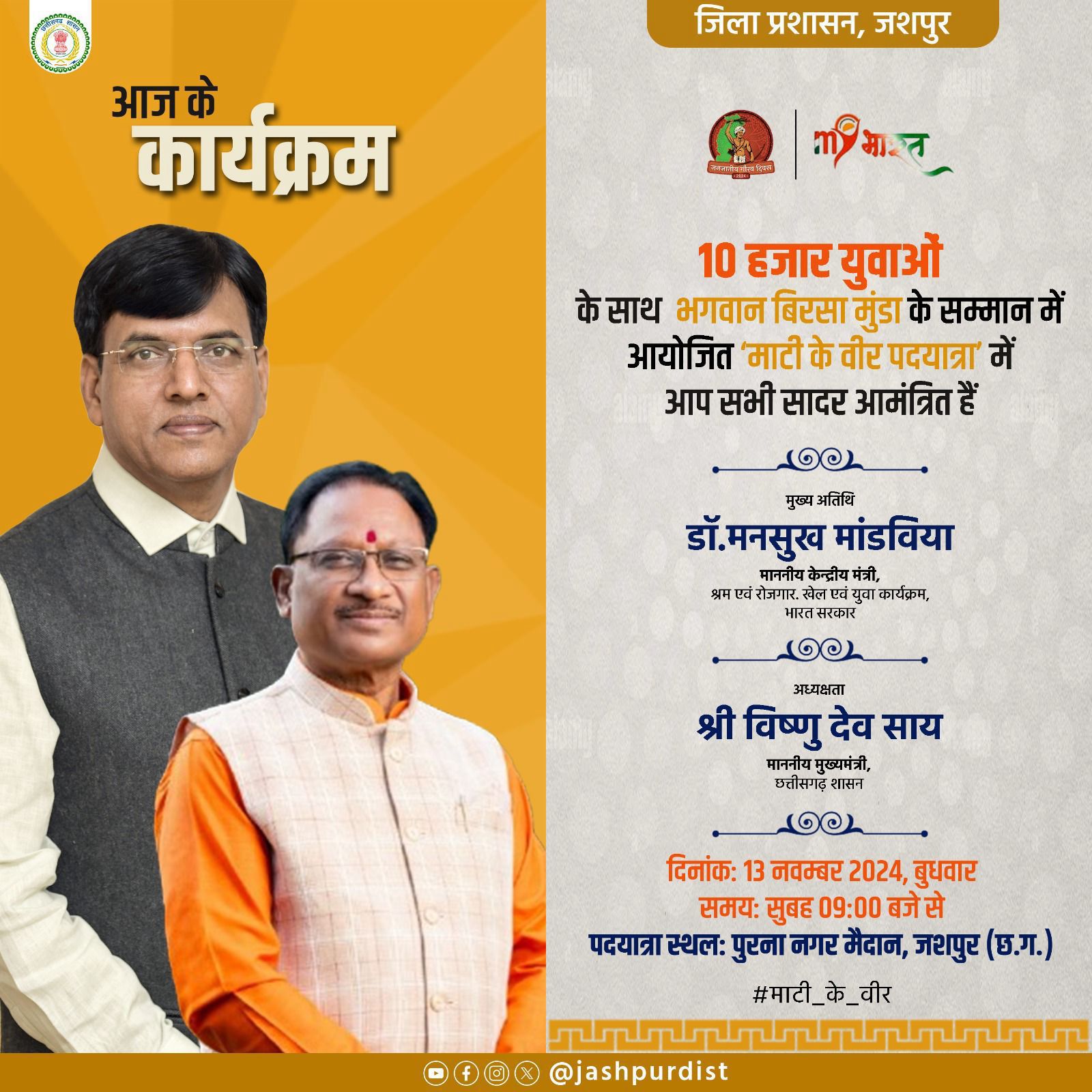 10,000 युवाओं के साथ भगवान बिरसा मुंडा के सम्मान में आयोजित ‘माटी के वीर पदयात्रा’ में आप सभी सादर आमंत्रित हैं