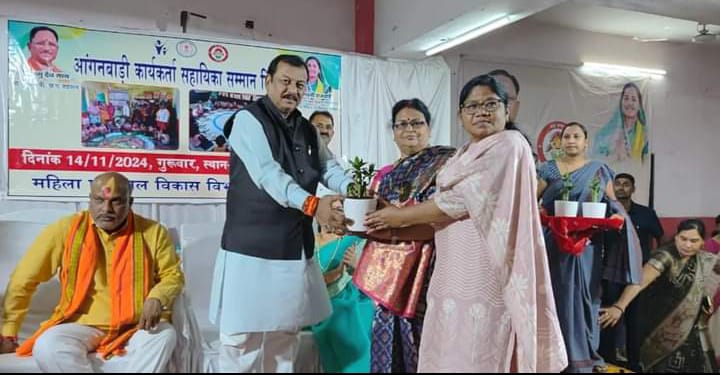 दुर्ग जिला महिला एवं बाल विकास विभाग द्वारा आंगनबाड़ी की कार्यकर्ताओं एवं सहायिकाओं के सम्मान समारोह का कार्यक्रम आयोजित किया गया जिसमें मुख्य अतिथि के रूप में उपस्थित हुए दुर्ग लोकसभा के सांसद विजय बघेल आंगनबाड़ी के माध्यम से छोटे छोटे बच्चों एवं गर्भवती महिलाओं की सेवा के अलावा बहुत सी शासकीय ज़िम्मेदारियों का निर्वहन करने वाली कार्यकर्ता एवं सहायिका बहनों का सम्मान कर उन्हें बधाई एवं शुभकामनाएं दी। इन्हीं बहनों के अथक प्रयास से हमारा दुर्ग जिला पूरे छत्तीसगढ़ में सुपोषण के मापदंड में प्रथम स्थान अर्जित किया है। दुर्ग ग्रामीण के विधायक ललित चंद्राकर उपस्थित थे
