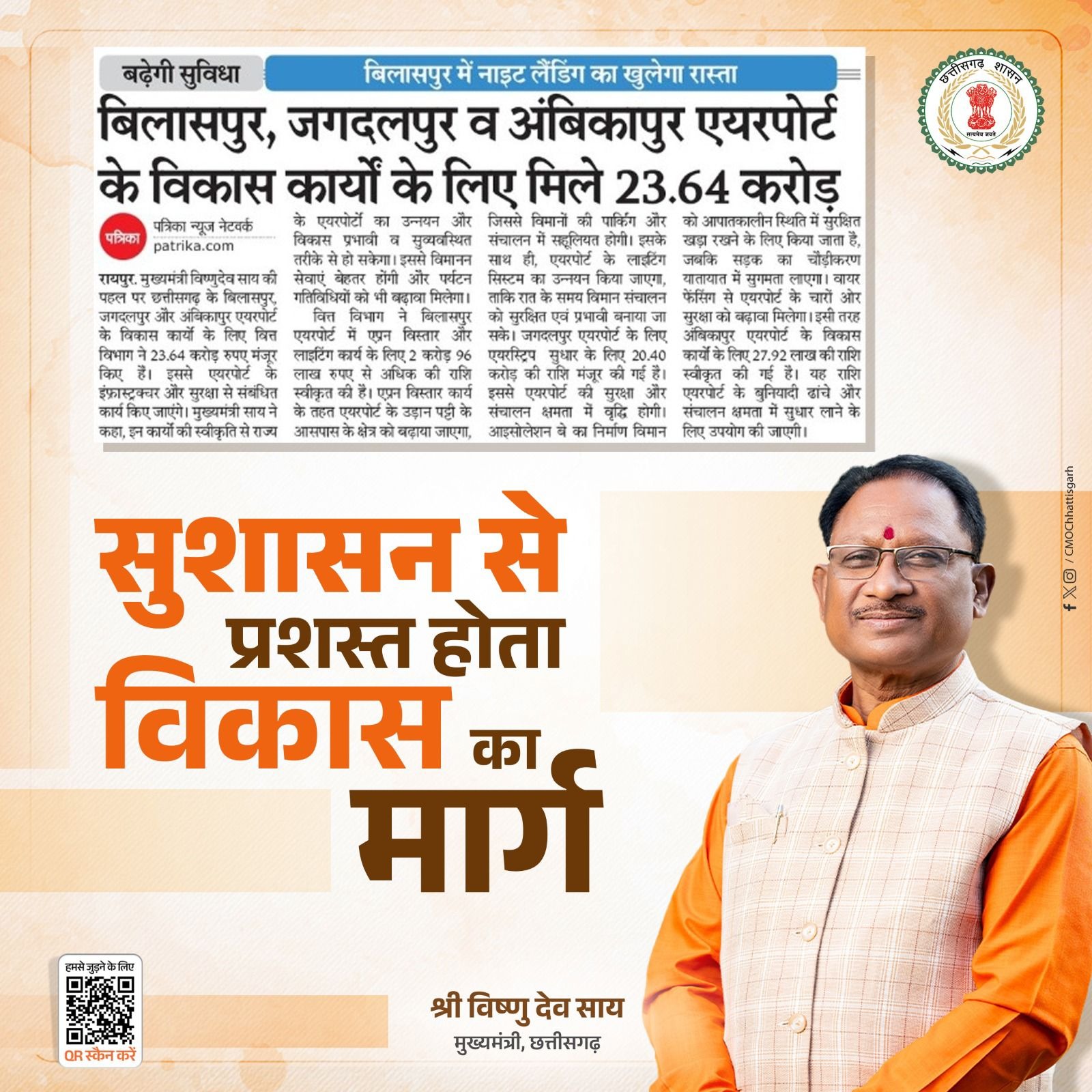 रायपुर- मुख्यमंत्री विष्णुदेव साय की पहल पर छत्तीसगढ़ के बिलासपुर, जगदलपुर और अंबिकापुर एयरपोर्ट के विकास कार्यों के लिए वित्त विभाग ने 23.64 करोड़ रुपए की स्वीकृति प्रदान की है। इससे एयरपोर्ट के इंफ्रास्ट्रक्चर और सुरक्षा से संबंधित कार्य किए जाएंगे। मुख्यमंत्री श्री साय ने कहा कि इन कार्यों की स्वीकृति से राज्य के एयरपोर्टों का उन्नयन और विकास प्रभावी व सुव्यवस्थित तरीके से हो सकेगा। इससे विमानन सेवाएं बेहतर होंगी और पर्यटन गतिविधियों को भी बढ़ावा मिलेगा।