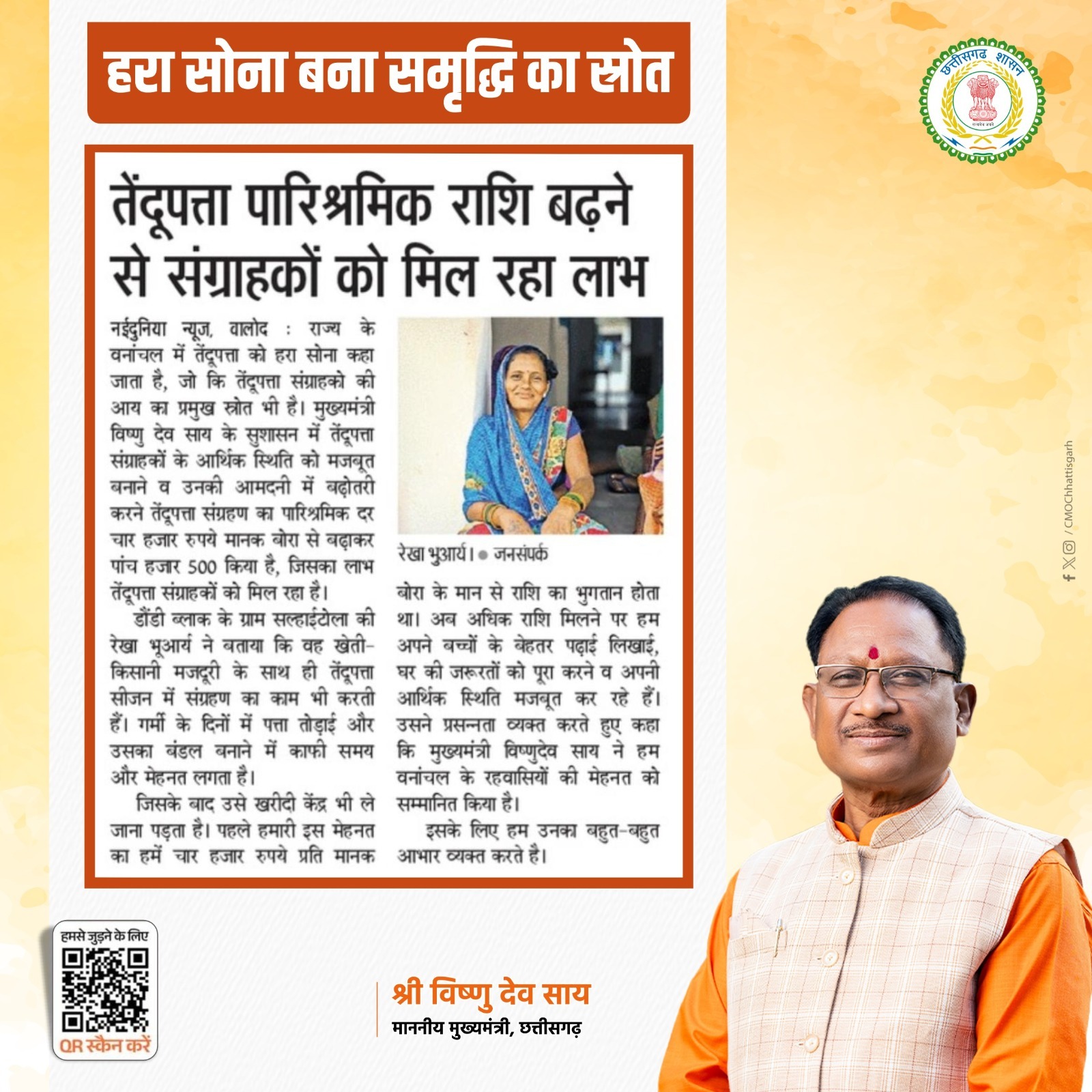 मुख्यमंत्री विष्णु देव साय के सुशासन में तेंदूपत्ता संग्राहकों की आय बढ़ाने वाली जो पहल की गई है, उससे अब खुशहाली का रंग दिखने लगा है। तेंदूपत्ता संग्रहण पारिश्रमिक बढ़ने से उनकी बहुत सारी ज़रूरतें पूरी होने लगी है और जीवन स्तर में उल्लेखनीय सुधार आया है।