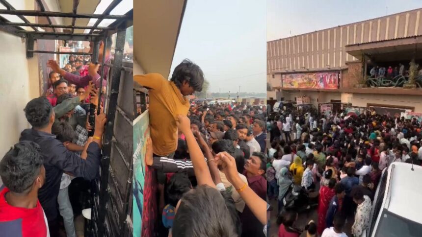 रायपुर : फिल्म पुष्पा-2 लगातार चर्चाओं में हैं। वह रिकॉर्ड तोड़ कमाई कर रही है तो वहीं दर्शकों में भी इसका क्रेज लगातार बना हुआ है। सिनेमा घरों के बाहर भारी भीड़ है और हर कोई इस फिल्म को देखने की कोशिश में लगा हुआ है। फिल्म के टिकटों को लेकर सिनेमा घरों में मारामारी भी हो रही है। वहीं राजधानी रायपुर में भी ऐसा ही हाल देखने को मिल रहा है, यहां रविवार को श्याम टॉकीज में लोगों की भारी भीड़ फिल्म पुष्पा 2 को देखने पहुंची, इस दौरान टॉकीज में घुसने को लेकर भीड़ बेकाबू होती नजर आई और एक दूसरे के ऊपर चढ़कर अंदर घुसने की कोशिश की गई, वहीं सुरक्षा व्यवस्था के भी इंतेजाम नहीं किए गए थे, जिससे बड़ी अनहोनी होने की संभावना बनी हुई थी, इसके साथ ही सड़क पर गाड़ियों की लंबी कतार भी देखने को मिली, जिससे आम जनता को घंटों सड़क पर जाम का सामना करना पड़ा, बताया जा रहा है कि यह दिन का पहला शो था, वहीं दर्शक टॉकीज के अंदर ही थी उसी दौरान बहार दूसरे शो के लिए भारी भीड़ इक्कठा हो गई थी।