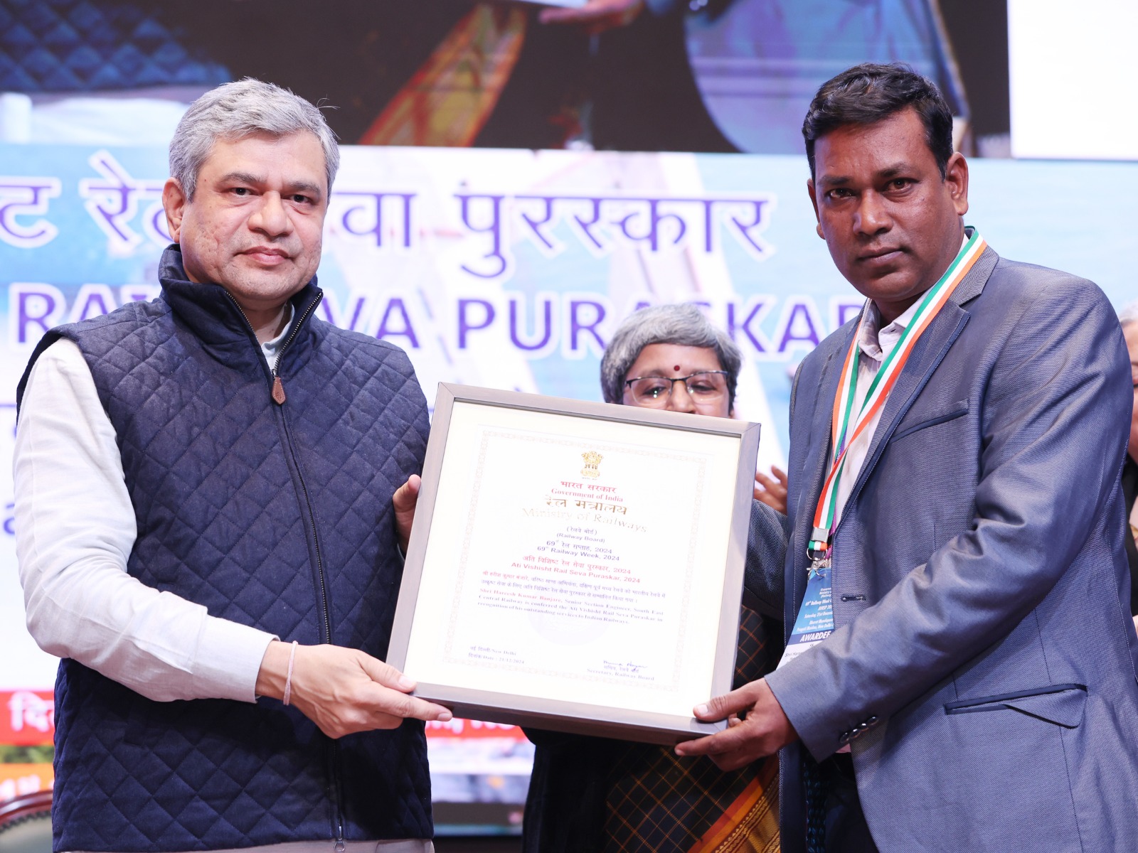 रेल मंत्री अश्विनी वैष्णव ने रायपुर रेल मंडल के हरीश कुमार बंजारे सीनियर सेक्शन इंजीनियर (टीआरडी) को भारत मंडपम में आयोजित कार्यक्रम में अति विशिष्ट रेल सेवा पुरस्कार से समानित किया