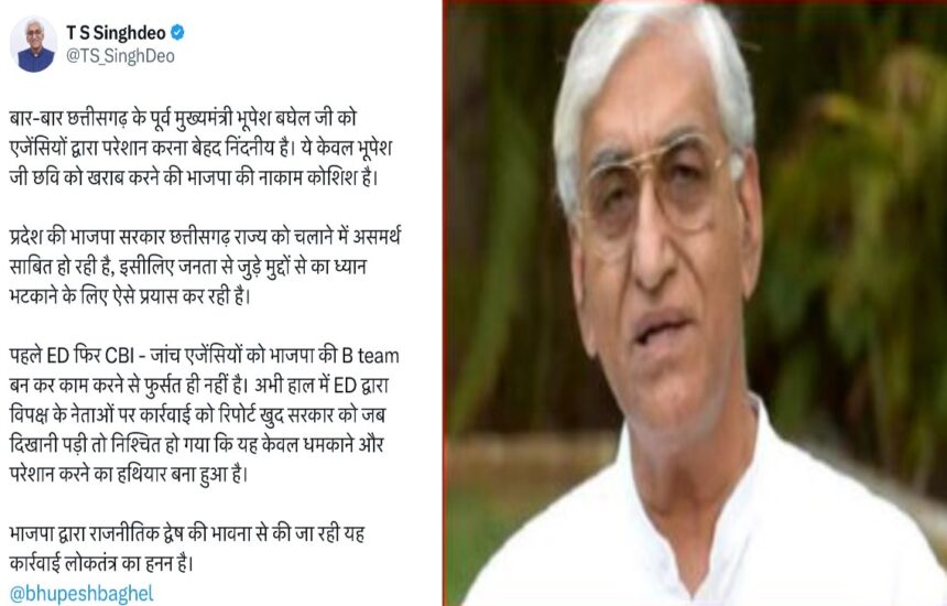 टीएस सिंहदेव ने सोशल मीडिया पर पोस्ट करते हुए केंद्र और राज्य की भाजपा सरकार पर निशाना साधा। उन्होंने कहा कि बार-बार पूर्व मुख्यमंत्री भूपेश बघेल को जांच एजेंसियों के जरिए परेशान करना निंदनीय है। यह केवल उनकी छवि खराब करने की एक नाकाम कोशिश है।