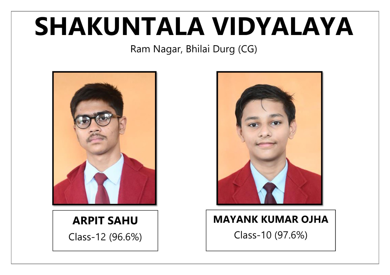 भिलाई-सीबीएसई का रिजल्ट जारी होते साथ-साथ बच्चों का रिजल्ट सामने आ रहा है शकुंतला विद्यालय रामनगर भिलाई में अर्पित साहू 12वीं सीबीएसई 97% अर्जित किया वही कक्षा दसवीं में मयंक कुमार ओझा97.6% अर्जित किया वही शारदा विद्यालय कक्षा 12वीं में योगिता 97%, कक्षा दसवीं में शौर्य कुमार साहू 97.6%, कक्षा दसवीं अंकित देवांगन 97.6% सभी बच्चों ने इतनी परसेंटेज से पास होने का श्रेय स्कूल के टीचर एवं घर के माता-पिता साथ-साथ अपने मेहनत को को बताया स्कूल के चेयर पर्सन ने सभी विद्यार्थियों एवं अच्छे मार्क्स से पास किया विद्यार्थियों को उत्तीर्ण होने पर ढेर सारी शुभकामनाएं बधाई दी
