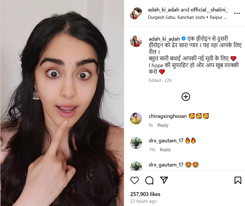 एक्ट्रेस अदा शर्मा ने वीडियो शेयर करते हुए छालीवुड एक्ट्रेस शालिनी के लिए लिखा- “एक हिरोइन की तरफ से दूसरी हिरोइन को ढेर सारा प्यार… आपकी नई मूवी के लिए बहुत सारी बधाई. I Hope (मैं उम्मीद करती हूं…) कि आपकी फिल्म सूपरहिट हो और आप खूब तरक्की करो.