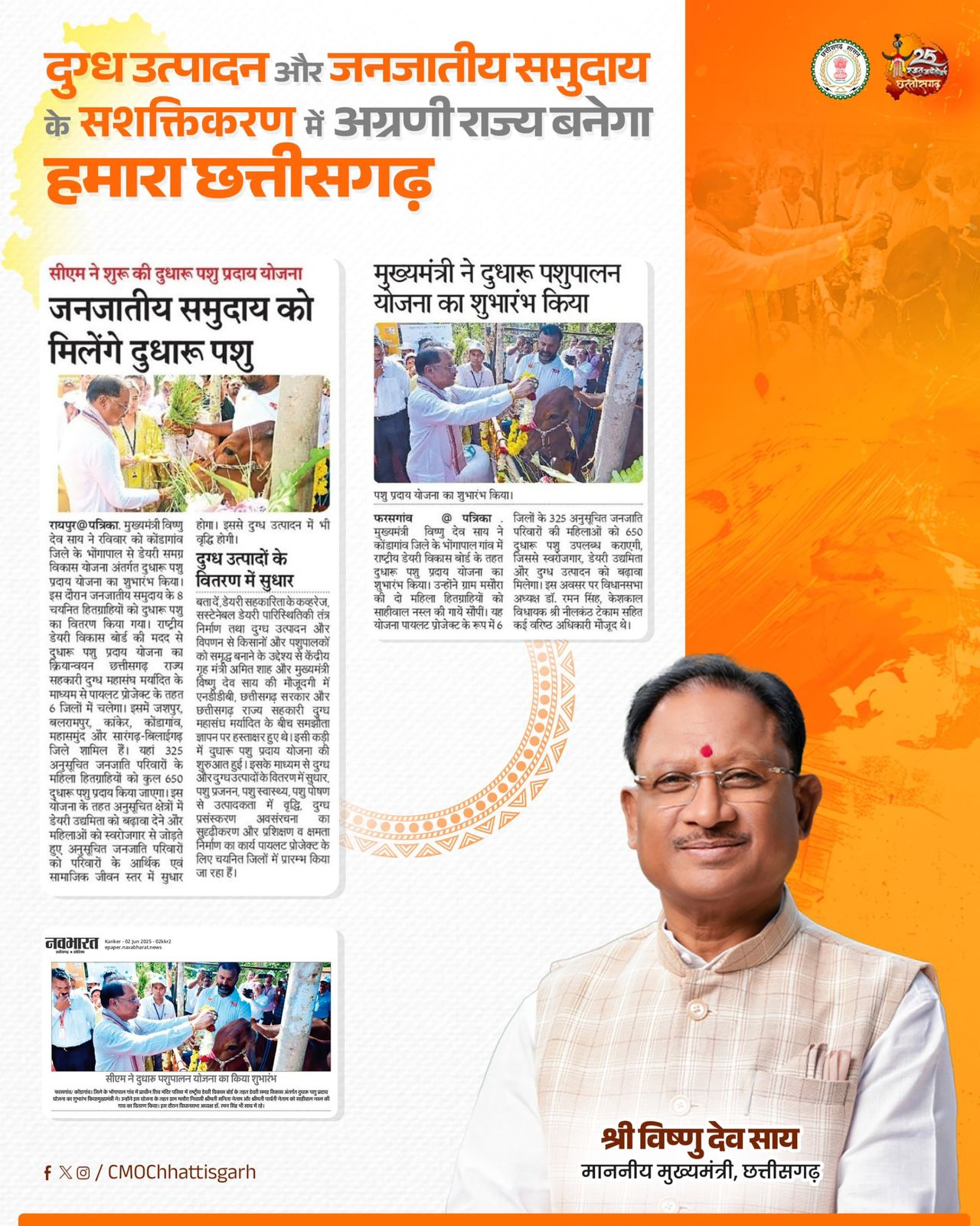 पशुपालन से महिला सशक्तिकरण की राह करेगी सुनिश्चित, दुधारू पशुपालन योजना मुख्यमंत्री श्री विष्णु देव साय के नेतृत्व में सरकार द्वारा जनजातीय समुदाय को डेयरी व्यवसाय से जोड़कर आत्मनिर्भर बनाया जा रहा है।