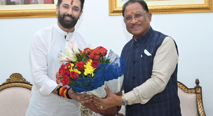 रायपुर – मुख्यमंत्री विष्णु देव साय से आज मुख्यमंत्री निवास कार्यालय में केन्द्रीय खाद्य प्रसंस्करण उद्योग मंत्री श्री चिराग पासवान ने सौजन्य मुलाकात की। इस दौरान साय ने पासवान को कोसा वस्त्र एवं बेल मेटल से बने स्मृति चिन्ह भेंटकर आत्मीय स्वागत किया। गौरतलब है कि केन्द्रीय खाद्य प्रसंस्करण उद्योग मंत्री चिराग पासवान आज एक दिवसीय प्रवास पर छत्तीसगढ़ पहुंचे थे।