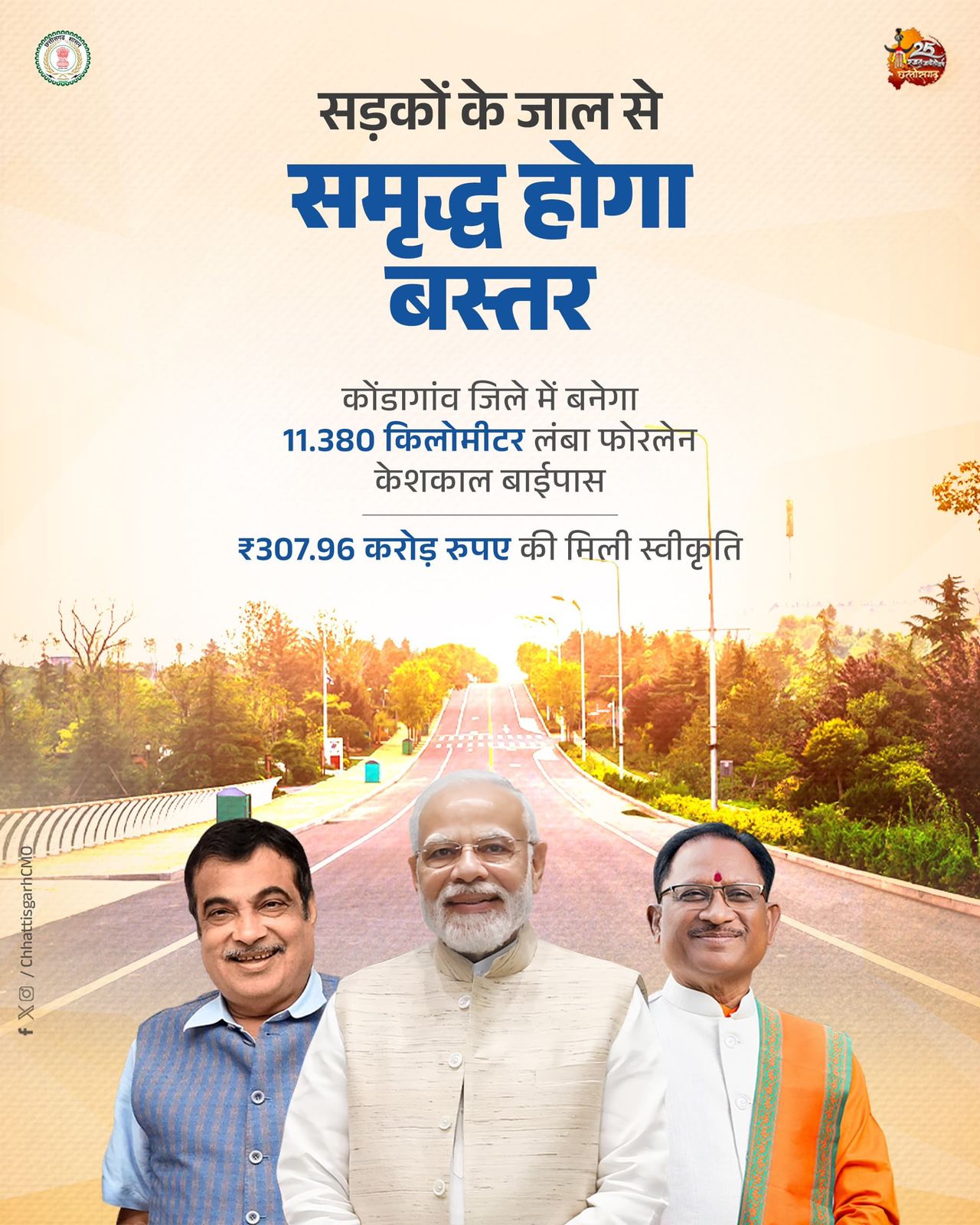 केंद्रीय सड़क परिवहन एवं राजमार्ग मंत्रालय ने कोंडागांव जिले में केशकाल घाट को सुगम और सुरक्षित बनाने के लिए 307.96 करोड़ रुपए की लागत से 11.380 किलोमीटर लंबा 4-लेन बाईपास निर्माण अपग्रेड की स्वीकृति दी है।