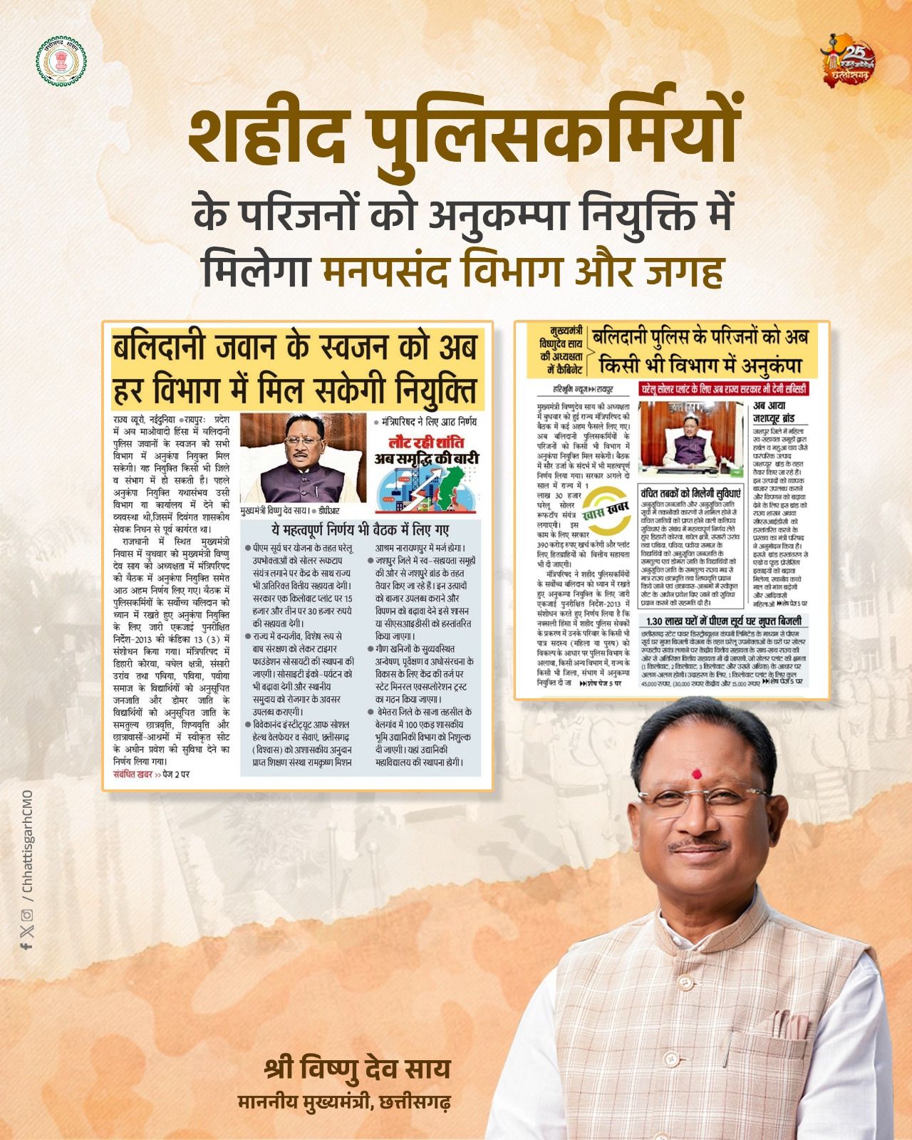 नक्सली हिंसा में शहीद पुलिस कर्मियों के परिजनों को अब केवल पुलिस विभाग में ही नहीं, बल्कि राज्य के किसी भी विभाग और किसी भी जिले/संभाग में अनुकम्पा नियुक्ति मिल सकेगी।