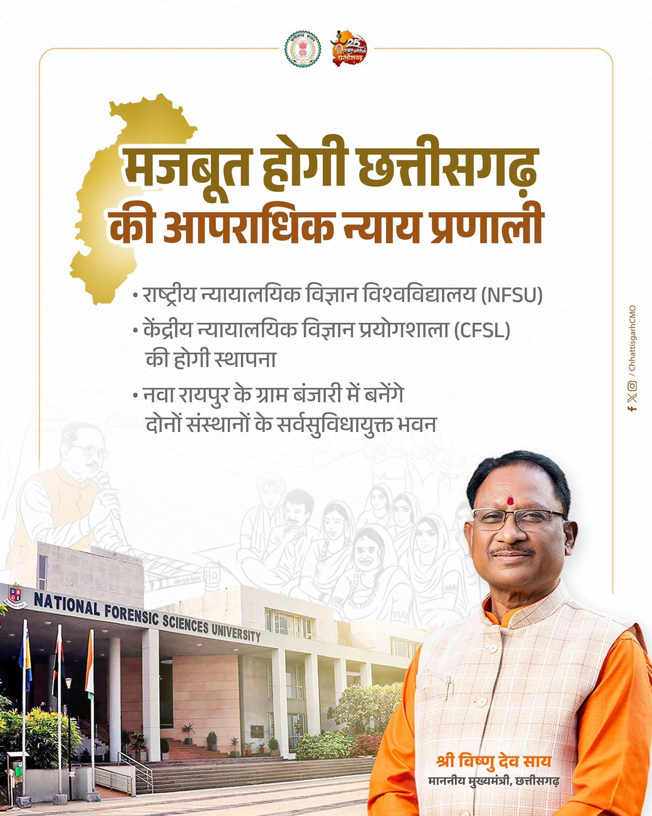 प्रधानमंत्री नरेंद्र मोदी जी एवं केंद्रीय गृह मंत्री अमित शाह जी के कुशल मार्गदर्शन तथा मुख्यमंत्री विष्णु देव साय के मजबूत नेतृत्व में नवा रायपुर स्थित ग्राम बंजारी के 40 एकड़ क्षेत्रफल में राष्ट्रीय न्यायालयिक विज्ञान विश्वविद्यालय (NFSU) और केंद्रीय न्यायालयिक विज्ञान प्रयोगशाला (CFSL) का सर्वसुविधायुक्त भवन स्थापित होगा। इन संस्थानों के निर्माण से न केवल छत्तीसगढ़ बल्कि पूरे मध्य भारत को आधुनिक न्याय प्रणाली और अपराध जांच में सशक्त आधार मिलेगा।