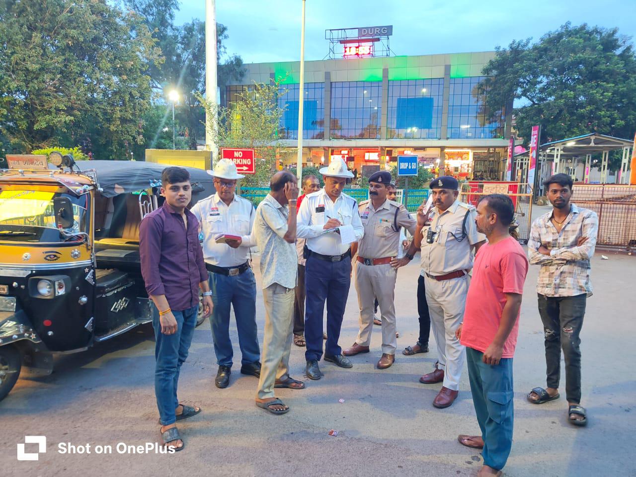 यातायात पुलिस दुर्ग द्वारा कल दिनांक को ई रिक्शा एवं ऑटो चालको का लिस्टिंग करने हेतु शहर के प्रमुख भीड भाड वाले स्थान जैसे दुर्ग रेलवे स्टेशन, दुर्ग बस स्टेण्ड, पावर हाउस रेलवे स्टेशन, रेलवे स्टेशन भिलाई 03, रेलवे स्टेशन सेक्टर 01 में चेकिंग किया गया और सभी को समझाईश दी गयी की वाहन के सम्पूर्ण कागजात पूर्ण रखे, बिना लाइसेंस वाहन ना चलाये, नाबालिक को वाहन चलाने ना दे, बिना वर्दी वाहन ना चलाये, नो पार्किग में वाहन खडा ना करें, अधिक सवारी ना बैठाये, समझाईश दी गयी। साथ ही चालकों का वाहन नंबर, पता, नाम मोबाइल नंबर नोट किया गया। ताकी भविष्य में इन्हे प्रशिक्षण दे कर निर्धारित रुट में चलने हेतु निर्देशित किया जा सके। समझाईश के साथ यातायात पुलिस दुर्ग द्वारा लापरवाह कुल-55 ई रिक्शा एवं ऑटो चालको पर कार्यवाही भी किया गया।