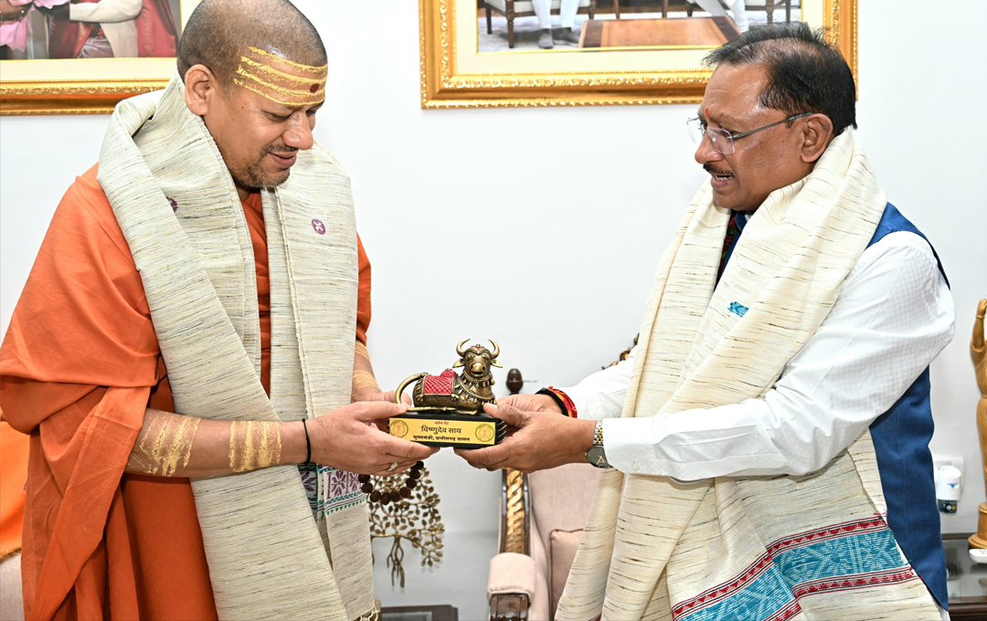 रायपुर 29 जून 2025/मुख्यमंत्री श्री विष्णु देव साय से आज निरंजन पीठाधीश्वर महामंडलेश्वर डॉ. स्वामी कैलाशनंद गिरी जी महाराज ने सौजन्य भेंट की।