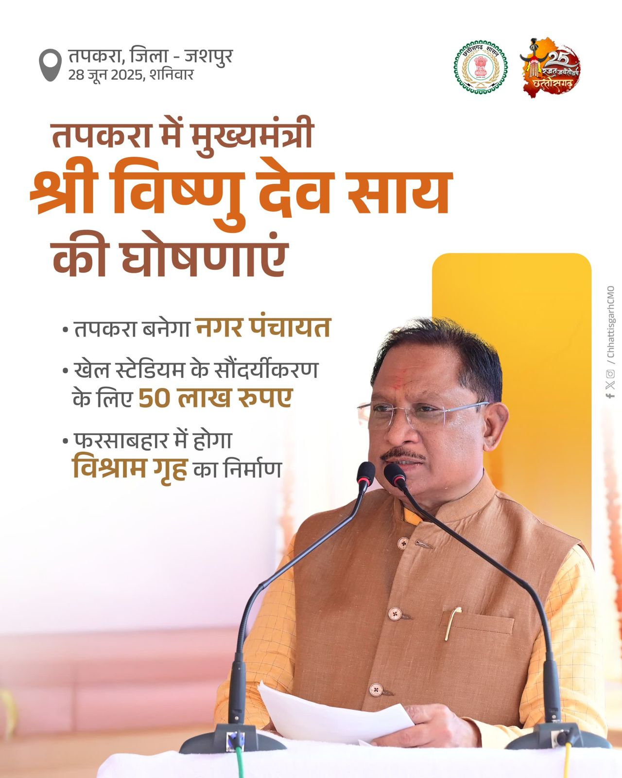 मुख्यमंत्री विष्णु देव साय ने आज तपकरा में आयोजित कार्यक्रम में लोगों की बहुप्रतीक्षित मांग को पूरा करते हुए तपकरा को नगर पंचायत बनाने की महत्वपूर्ण घोषणा की। साथ ही तपकरा स्थित खेल स्टेडियम के सौंदर्यीकरण के लिए 50 लाख रुपए देने और फरसाबहार में विश्राम गृह निर्माण की भी घोषणा की।