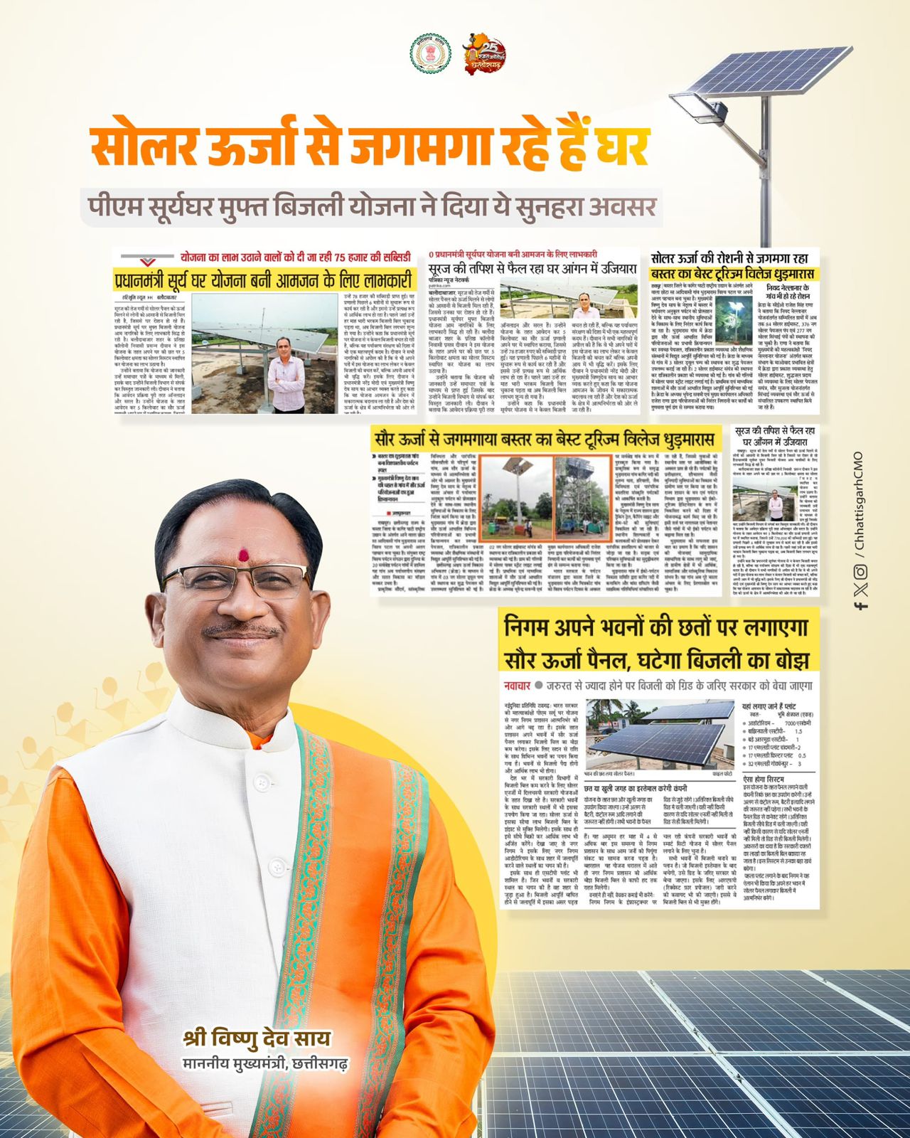 मुख्यमंत्री श्री विष्णु देव साय के सुशासन में ‘प्रधानमंत्री सूर्यघर मुफ्त बिजली योजना’ के सफल क्रियान्वयन से हितग्राहियों को किफायती बिजली मिलने के साथ-साथ पर्यावरण की सुरक्षा भी सुनिश्चित हो रही है। साथ ही बिजली के पारंपरिक स्रोत पर दबाव भी कम हो रहा है।