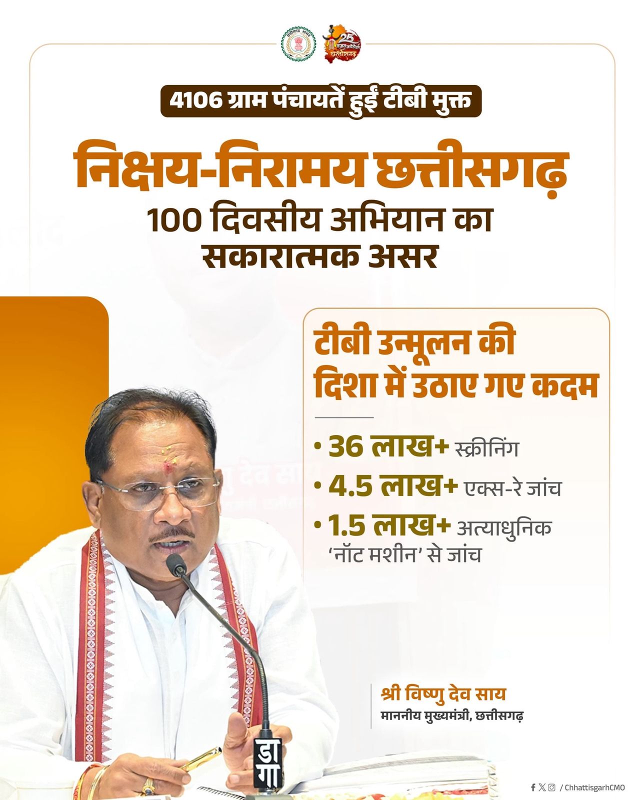 निक्षय-निरामय छत्तीसगढ़ अभियान के तहत अब तक 36 लाख से अधिक लोगों की स्क्रीनिंग की गई, 4.5 लाख से अधिक एक्स-रे जांचें की गईं और 1.5 लाख से अधिक व्यक्तियों की जांच अत्याधुनिक ‘नॉट मशीन’ से की गई है। इस व्यापक अभियान से छत्तीसगढ़ को बेहतर सफलता हासिल हो रही है।