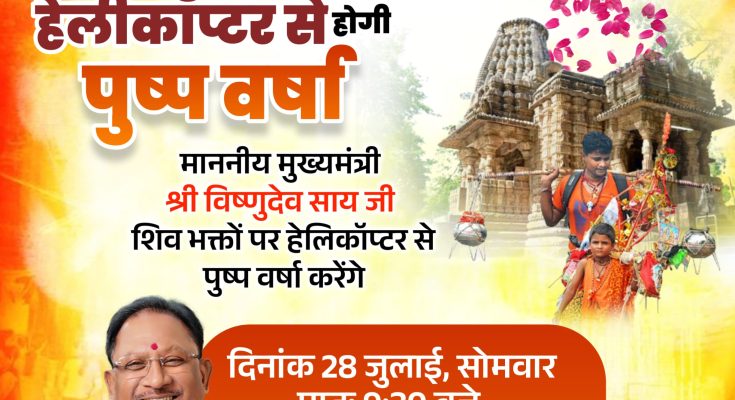 रायपुर- श्रावण मास के तीसरे सोमवार को छत्तीसगढ़ के कबीरधाम जिले में स्थापित बाबा भोरमदेव धाम एक बार फिर श्रद्धा, भक्ति और सनातन आस्था का जीवंत प्रतीक बनने जा रहा है। इस अवसर पर मुख्यमंत्री श्री विष्णुदेव साय हेलीकॉप्टर से भोरमदेव मंदिर परिसर पहुँचकर सुबह कावड़ यात्रा में शामिल श्रद्धालुओं, भक्तों और कावड़ियों का पुष्प वर्षा कर स्वागत और अभिनंदन करेंगे। यह लगातार दूसरा वर्ष है जब मुख्यमंत्री स्वयं श्रद्धालुओं का पुष्प वर्षा के माध्यम से स्वागत कर रहे हैं।