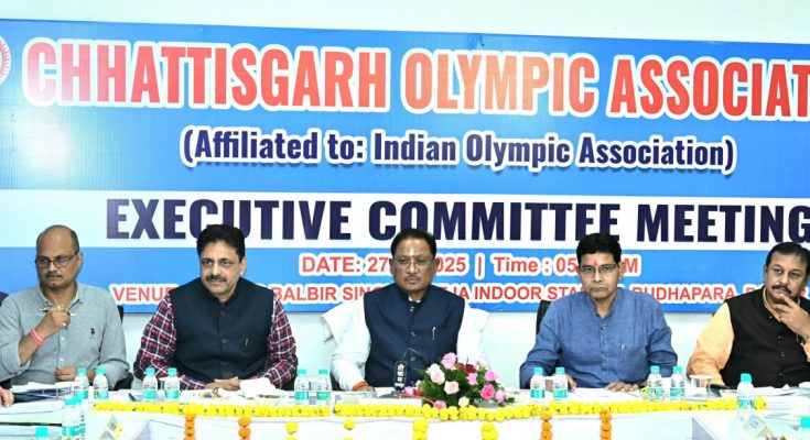 रायपुर :मुख्यमंत्री श्री विष्णु देव साय आज राजधानी रायपुर स्थित सरदार बलबीर सिंह जुनेजा इंडोर स्टेडियम में आयोजित छत्तीसगढ़ ओलंपिक संघ की कार्यकारिणी बैठक में शामिल हुए। इस अवसर पर वर्ष 2025-26 के वार्षिक बजट का अनुमोदन किया गया। साथ ही, मुख्यमंत्री श्री साय ने स्टेडियम परिसर में संघ के अध्यक्ष के नवीन कार्यालय कक्ष का विधिवत उद्घाटन भी किया।