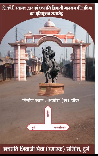 दुर्ग-शिवनेरी स्वागत द्वार एवं छत्रपति शिवाजी महाराज की प्रतिमा का भूमि पूजन समारोह का आयोजन 10 अगस्त दोपहर 1:00 बाजार चौक अंजोरा में होने जा रहा है छत्रपति शिवाजी महाराज की प्रतिमा भूमि पूजन कार्यक्रम में मुख्य अतिथि के रूप में प्रदेश के पूर्व मुखिया मुख्यमंत्री भूपेश बघेल उपस्थित होंगे एवं अध्यक्षता करेंगे ललित चंद्राकर विधायक दुर्ग ग्रामीण, विशेष अतिथि में उपस्थित होंगे डोमार लाल कोसेवाड अहिवारा विधानसभा के विधायक, चौकी मानपुर मोहला के विधायक इंद्र शाह मांडवी, एवं कुंवर सिंह निषाद विधायक कुंदरदेही, जागेश्वर साहू पूर्व मंत्री मध्य प्रदेश शासन, अलका बाघमार महापौर नगर निगम दुर्ग, योगेश बेल चंदन केंद्रीय अध्यक्ष छत्तीसगढ़ दिल्लीवार कु क्ष समाज, मोहन हरमुख पूर्व अध्यक्ष जनपद पंचायत दुर्ग, उपस्थित रहेंगे सभी अतिथिगण यह भूमि पूजन का आयोजन छत्रपति शिवाजी सेवा (स्मारक) समिति दुर्गा द्वारा आयोजन किया जा रहा है विनीत संतोष सारथी सरपंच एवं समस्त पदाधिकारी अंजोरा (ख)