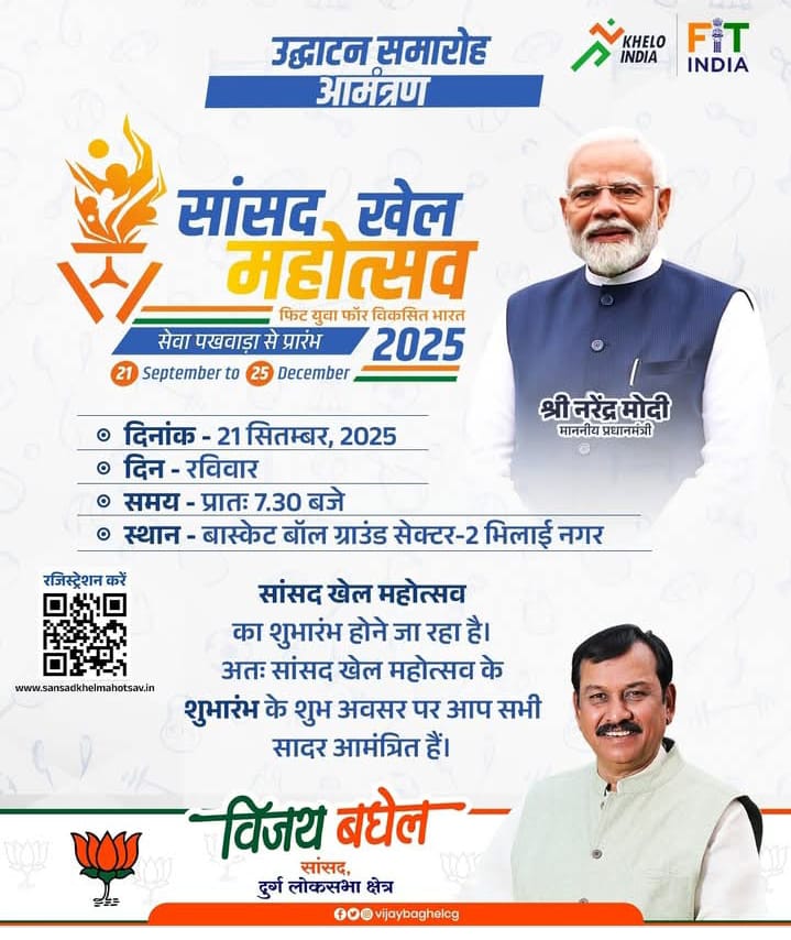 मान. प्रधानमंत्री Narendra Modi जी के आह्वान पर सांसद खेल महोत्सव के तहत मेरे दुर्ग लोकसभा क्षेत्र में खेल महोत्सव का आगाज़ कल 21 सितंबर 2025 को सेक्टर 2 भिलाई नगर बास्केट बॉल मैदान में सुबह 8.30 बजे मशाल प्रज्वलित कर किया जाएगा। लोकसभा क्षेत्र के 9 विधानसभा क्षेत्र में मशाल को भ्रमण हेतु रवाना किया जाएगा एवं शाम 6 बजे उसी मैदान पर मशाल वापस लाया जाएगा इस कार्यक्रम में हजारों की संख्या में खिलाड़ी एवं खेल प्रेमी नागरिकगण उपस्थित रहेंगे। आगे का कार्यक्रम 25 दिसंबर तक प्रत्येक गांव में चिन्हित खेलों के आयोजन के साथ पूरे लोकसभा में संपन्न होगा।