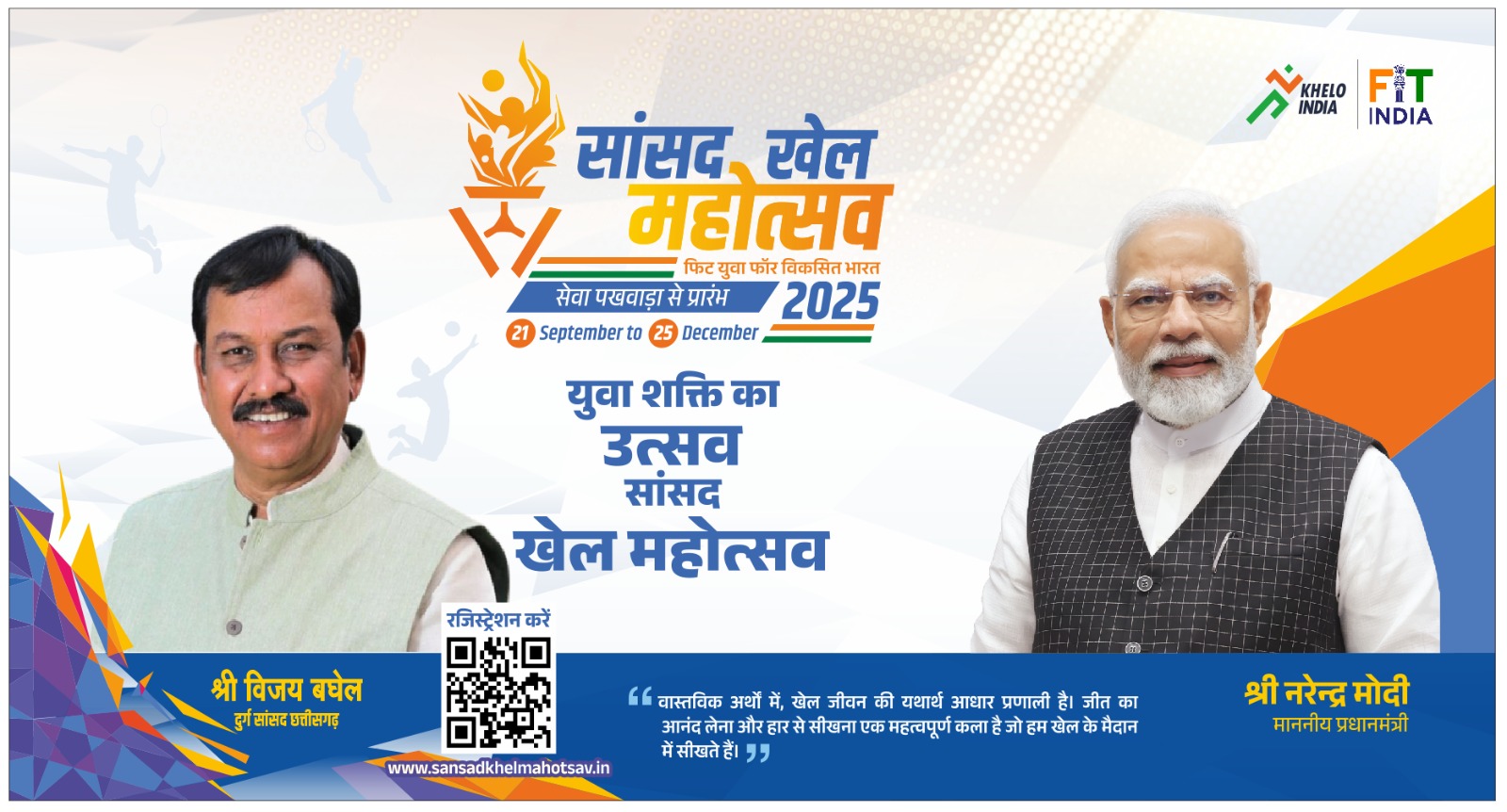 सांसद खेल महोत्सव के लिए पंजीयन की तिथि 11 सितम्बर से 25 सितम्बर 2025 तक किया जा चुका है। इसमें व्यक्तिगत खेल एथेलिटिक्स, गेड़ी, योगासन, वेटलिफ्टििंग, कुश्ती, फुगड़ी एवं सुरीली कुर्सी एवं सामूहिक खेलों में वालीबाॅल, खो-खो एवं कबड्डी को शामिल किया गया है। इस खेल में महिला, पुरूष, दिव्यांग प्रतिभागी की आयु 9 से 15 वर्ष, 15 से 30 वर्ष व 30 से अधिक आयु वर्ग के प्रतिभागी शामिल हो सकते है। खेल का लेवल ग्राम पंचायत व नगरीय प्रशासन वार्ड में 6 से 10 अक्टूबर, कलस्टर व नगरीय में 11 से 17 अक्टूबर, विधानसभा क्षेत्र में 10 से 15 नवम्बर एवं लोकसभा क्षेत्रों में 23 से 25 दिसम्बर तक खेला जाएगा। नगरीय क्षेत्रों में प्रतियोगिता आयोजन के नोडल अधिकारी आयुक्त एवं नगर पालिक अधिकारी होगें। खेल के दौरान विधानसभा भिलाईनगर-65 के लिए ड्रेस कलर लाल-निला एवं वैशालीनगर-66 के लिए गुलाबी रखा गया है।
