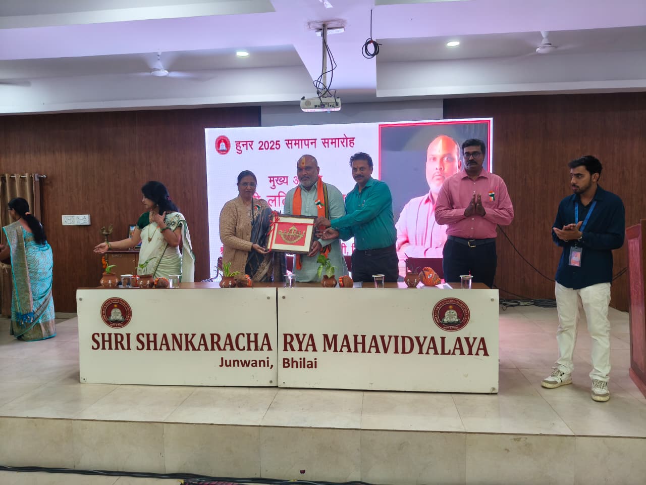 हुनर फेस्ट 25 के समापन समारोह के मुख्य अतिथि माननीय श्री ललित चंद्राकर जी विधायक दुर्ग ग्रामीण, महाविद्यालय की प्राचार्य डॉ अर्चना झा एवं डीन एकेडमिक डॉ जे दुर्गा प्रसाद राव उपस्थित रहे। कार्यक्रम का शुभारंभ महाविद्यालय की परंपरा अनुसार मां सरस्वती की मूर्ति पर माल्यार्पण कर एवं दीप प्रज्वलित कर किया गया। तत्पश्चात अतिथियों का स्वागत पौधा एवं श्रीफल भेंट कर बैज लगाकर स्वागत गान से किया गया। राज्य गीत अरपा पैरी के धार से छत्तीसगढ़ महतारी का वंदन किया गया।