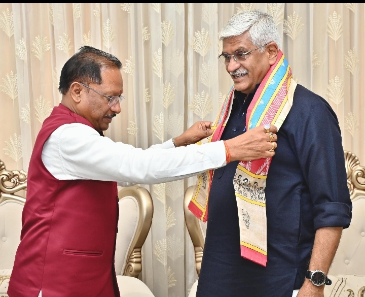 रायपुर 1 जनवरी 2025/ मुख्यमंत्री श्री विष्णु देव साय से आज नवा रायपुर, सेक्टर-24 स्थित मुख्यमंत्री निवास में केंद्रीय पर्यटन एवं संस्कृति मंत्री श्री गजेन्द्र सिंह शेखावत ने सौजन्य भेंट की। मुलाकात के दौरान छत्तीसगढ़ में पर्यटन विकास, सांस्कृतिक धरोहरों के संरक्षण एवं सुदृढ़ीकरण से संबंधित विषयों पर सौहार्दपूर्ण एवं रचनात्मक चर्चा हुई।