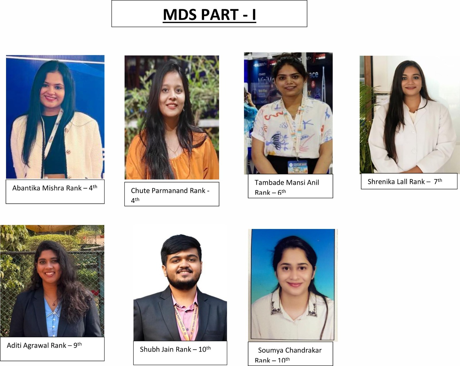एमडीएस पार्ट.1 में सी. परमानंद (अर्थोडोंटिक्स), अभनतिका मिश्रा (प्रोस्थोडोंटिक्स) ने चौथे स्थान प्राप्त किया तथा टेम्बरे मानसी अनिल (कन्जवेटिव एण्ड एंडोडोंटिंक्स), श्रेनिका लला(कन्जवेटिव एण्ड एंडोडोंटिंक्स), वर्धा (ओरल सर्जरी), अदिति अग्रवाल (कन्जवेटिव एण्ड एंडोडोंटिंक्स), साक्षी शरण (पेडोडोंटिक्स), सरनतिनी डे (पेडोडोंटिक्स), नागेश्वरराव कोसुरू (ओरल पैथोलॉजी), त्रोणाल बराई (ओरल पैथोलॉजी), सौम्या चन्द्राकर (कन्जवेटिव एण्ड एंडोडोंटिंक्स), शुभ जैन (पेरियोडोंटोलॉजी), ने क्रमशः छठवा, सातंवा, आठवा, नवां एवं दसवा स्थान प्राप्त किया।