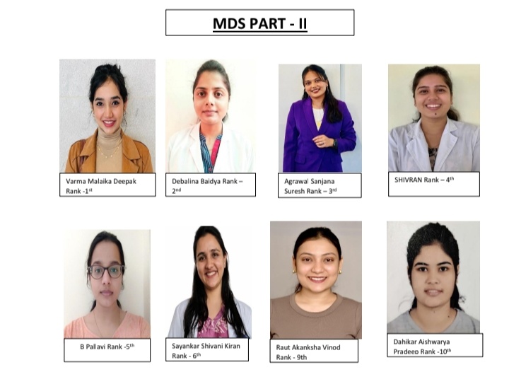 एमडीएस पार्ट. 2 में मलाइका वर्मा (कन्जबेटिव एण्ड एंडोडोंर्टिक्स) ने प्रथम स्थान प्राप्त किया, देवालीना (पेडोडाँटिक्स) ने द्वितीय स्थान प्राप्त किया तथा संजना अग्रवाल (प्रोस्थोडोंटिक्स), सिवरन (कन्जवेटिव एण्ड एंडोडोंटिंक्स), बी. पल्लवी (पेडोडोंटिक्स), सायनकर शिवांणी किरन (पेरियोडोंटोलॉजी), चंदन सिंह (ओरल सर्जरी), राउत अकांक्षा विनोद (पेरियोडोंटोलॉजी), दहिकर ऐश्वर्या प्रदीप (अर्थोडोंटिक्स) ने क्रमशः तीसरा, चौथा, पांचवा, सातंवा, आठवा, नवां एवं दसवा स्थान प्राप्त किया। साथ ही, एक और अच्छी बात यह है कि स्टूडेंट्स और आरसीडीएसआर ने न सिर्फ यूनिवर्सिटी मेरिट हासिल की, बल्कि वे भारत के सभी डेंटल कॉलेजों में सब्जेक्ट टॉपर भी रहे।